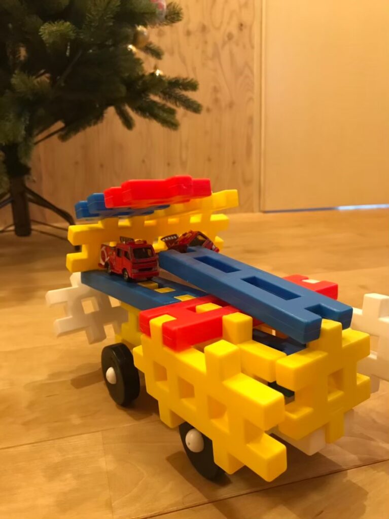 我が家には有名なレゴもありますが、最初に夢中になったのはニューブロックです。一つ一つのブロックが大きいので、とにかく大きなものが作れるのでミニカーの基地になってました。