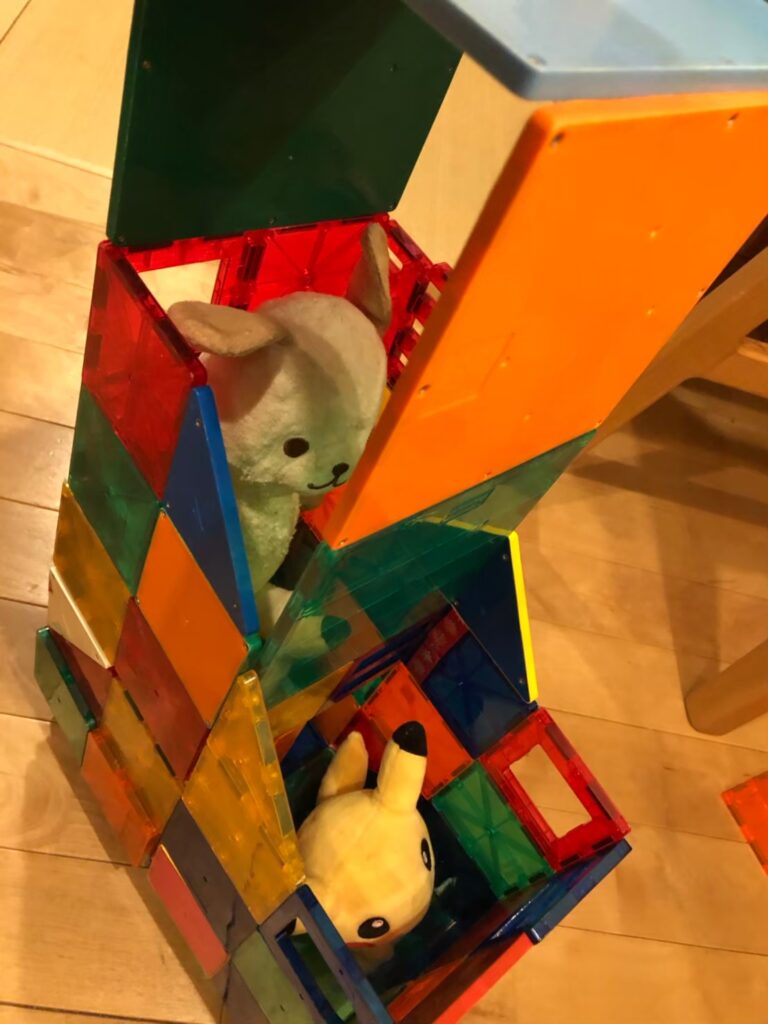 つぎはピタゴラスです。簡単にくっつくのですが、当然重くすると外れます。いつのまにかリブを入れることを体得してました。そしてジェンガ、ブロックではないのですが、木の感触と単純な形が想像力を引き出すようでピタゴラ装置を量産してます。