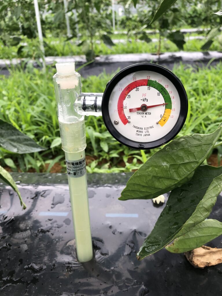 次に茎や幹を見てました。葉に水分を届けるのは茎と幹ですから。幹の中の水分になったつもりで茎を下から見上げると、茎はけっこう高くまで水を持ち上げるものだと思ったものです。その水分は土中で足りているのか心配になりました。農家さんは専用のメーターを持っているそうです。