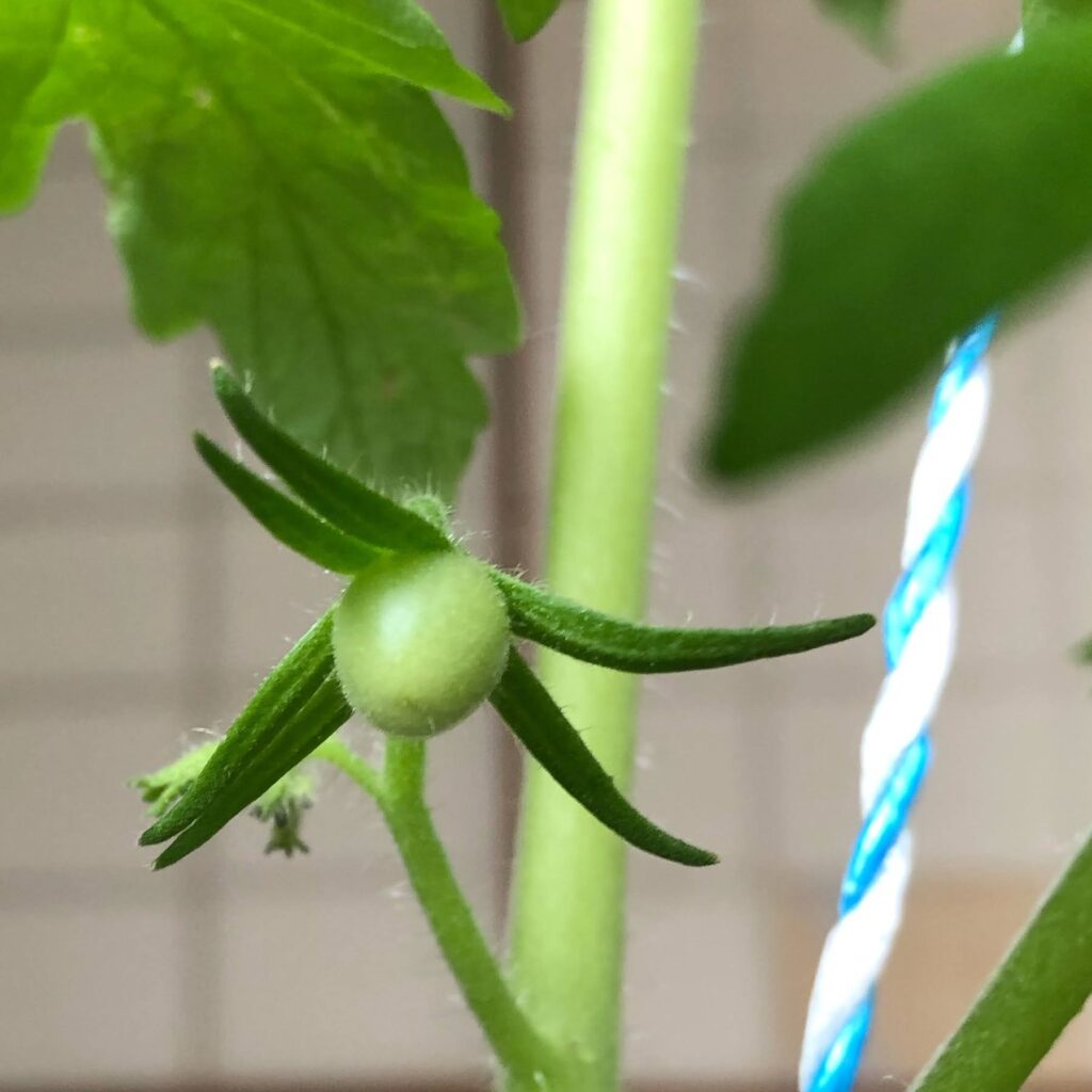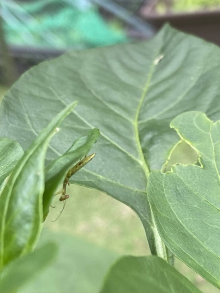 家庭菜園を始めた頃、やはり美味しく食べられる実が欲しかったのでトマトの青い実がついた時はうれしくて毎日見ていたものです。でもうまく育たないことも多いため、実が熟すまで太陽の恵みをエネルギーに変える葉を見ていました。温室の中の毎日の葉の動きを見たり、葉が食べられてる!と見たらカマキリ君を発見しました。